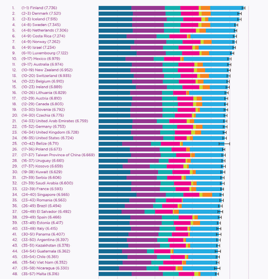 Auch auf den nächsten Rängen ändert sich in diesem Jahr nichts. Es gilt: Der Norden Europas ist die glücklichste Region der Welt. So behalten auch Dänemark, Island und Schweden ihre Spitzenplätze, auf Rang sieben folgt Norwegen.