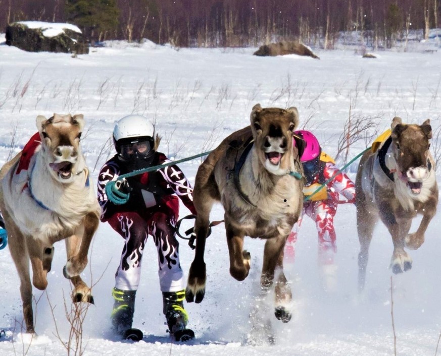 14 Rentiere und ihre Jockeys hatten am Saisonfinale des zunehmend beliebten arktischen Sports teilgenommen. Die Jockeys lassen sich mit Skiern von den Rentieren einen Kilometer lang um ein Oval ziehen. Das Spektakel zog hunderte Zuschauer an.