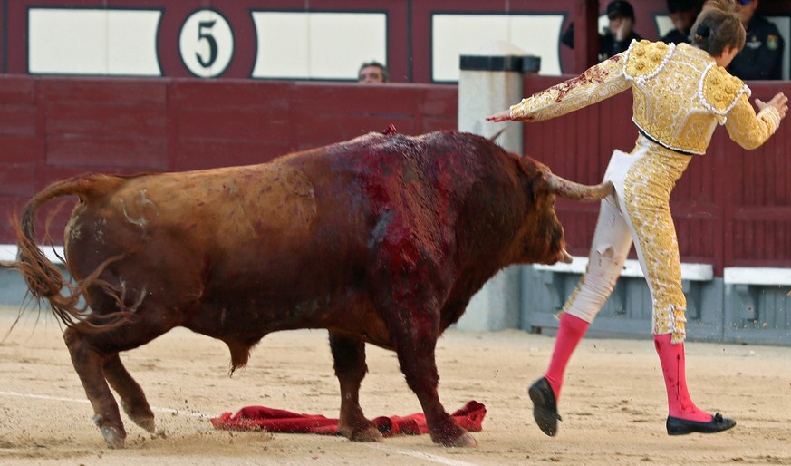 Bei einer Stierkampf-Veranstaltung in Madrid ist ein französischer Matador verletzt worden – an seinem Hinterteil. Zunächst hatte er den Bullen offenbar im Griff. Dann revanchierte sich das Tier und stiess seine Hörner in das Rektum des Stierkämpfers, wie «bild.de» berichtet. Der 26-Jährige zog sich eine 25 Zentimeter lange Wunde am Gesäss und einen Kreuzbeinbruch zu. Drei andere Kämpfer eilten ihm unverzüglich zur Hilfe und vertrieben das Tier.