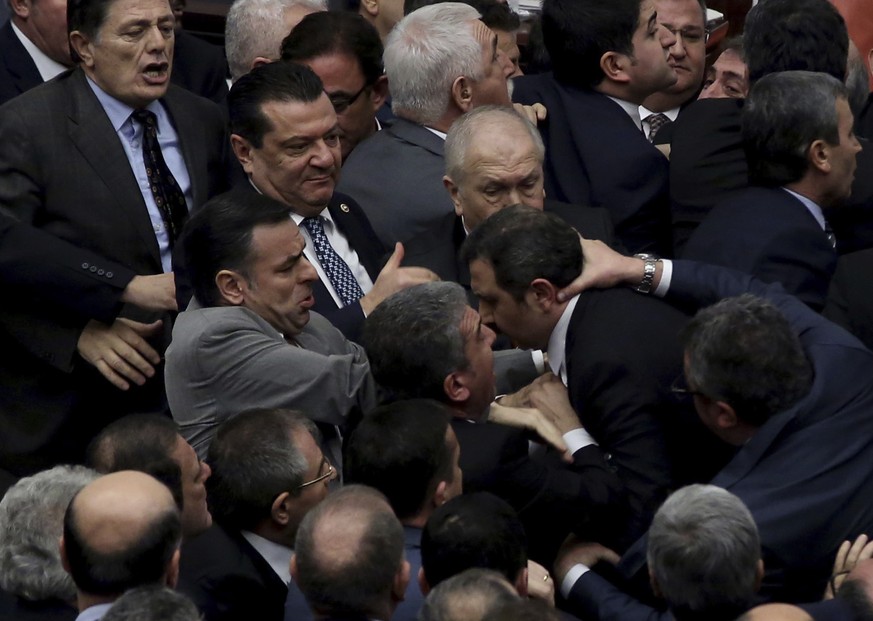 Auf einem Video ist zu sehen, wie ein Abgeordneter einen Kollegen am Hals packt. Auch das Rednerpult wurde beschädigt. «Wir sind nicht im Theater. Wir machen ernsthafte Arbeit, wir arbeiten im Namen der Nation», sagte der stellvertretende Parlamentspräsident Ahmet Aydin der Zeitung «Hürriyet». «Dieses Rednerpult ist das Pult der Nation.»
