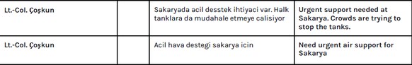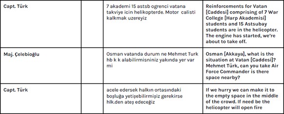 Nach und nach werden verschiedene hochrangige Offiziere zur Gruppe hinzugefügt. Celebioglu eröffnet die Konversation: «Ich bin Major Celebioglu. Ich werde hier öffentliche Bekanntmachungen vornehmen». «Ihr könnte hier wichtige Neuigkeiten posten. Ich werde sie Ankara [Hauptquartier der Putschisten] weiterleiten.»