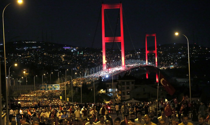 Tausende Unterstützer der türkischen Regierung folgten dem Aufruf in Istanbul. Sie marschierten vom Stadtteil Kisikli über eine der Bosporus-Brücken auf die europäische Seite der Stadt. Die Brücke musste am Abend für den Verkehr gesperrt werden.