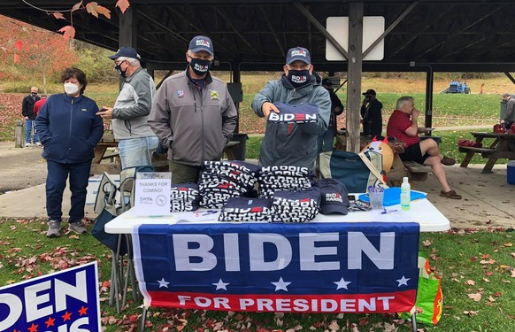 Hinter dem leeren Parkplatz des Baseballstadions haben die Demokraten einen kleinen Pavillon besetzt. Am letzten Ridin’ with Biden rally vor der Wahl verteilen sie Hüte, T-Shirts, Masken und Rasenschilder. Im Gras steht ein lebensgrosses Kandidatenpaar aus Pappe, neben dem man sich ablichten kann. Der Andrang ist, sagen wir: überschaubar. Etwa hundert Wählerinnen und Wähler seien erschienen, sagt Marcie Callan, treasurer der Washington-County-Demokraten. Bei den vorhergehenden Veranstaltungen seien es mehr gewesen, alles in allem hätten wohl zehntausend Personen sie besucht. In Washington County sind rund 100’000 Menschen wahlberechtigt.