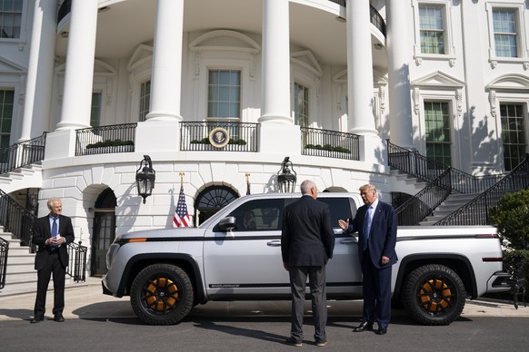 Vor dem Weissen Haus begutachtet Trump am Montag einen von Lordstown Motors hergestellten Pickup-Truck. Nebst den Vertretern des Unternehmens sind zwei Mitglieder des Kongresses anwesend.