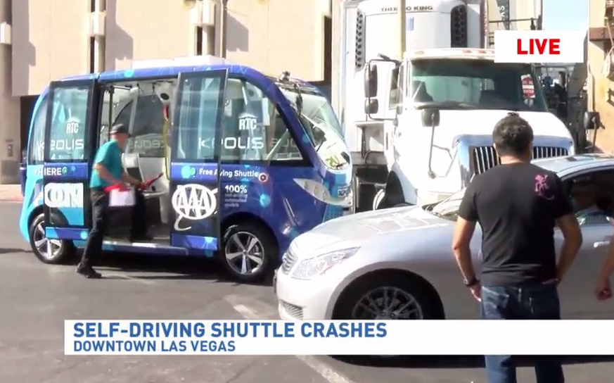 Nur eine Stunde kurvte der erste selbstfahrende Bus der USA auf dem Strip in Las Vegas herum. Dann krachte es bereits: Ein Lastwagen rammte das futuristische Vehikel seitlich.