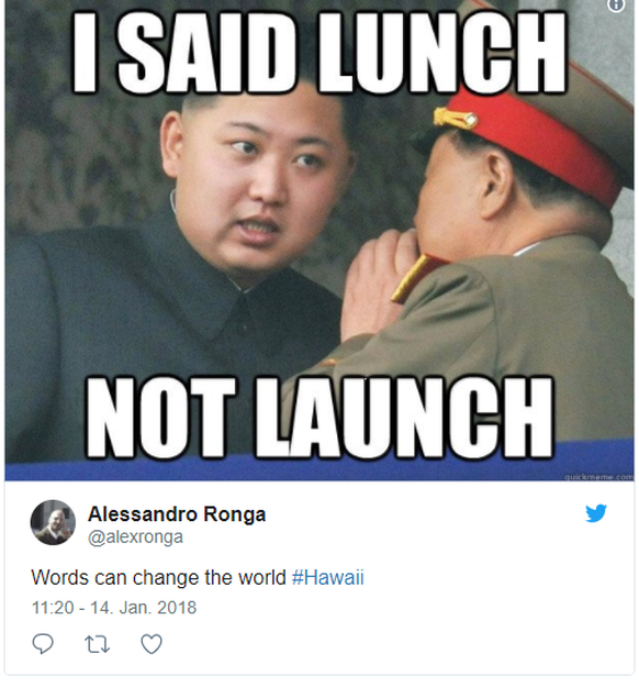 Die Regierung von Hawaii schätzt das anders ein: Im Falle eines echten Angriffs aus Nordkorea blieben den Bürgern zwischen Alarmierung und Einschlag 12 bis 15 Minuten Zeit, sich in Sicherheit zu bringen, wurde im Oktober 2017 in einem Informationsschreiben vorgerechnet. Es werde damit gerechnet, dass 90 Prozent der Inselbewohner so einen Angriff überleben könnten.
