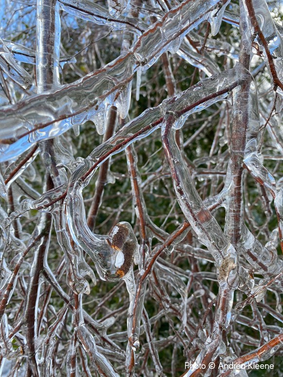 Im Februar 2021 fing Andrea Kleene nach einem besonders intensiven Eisregen diese in Eis eingekleideten Äste ein. Das Phänomen entsteht, wenn unterkühlter Regen auf eine kalte Oberfläche trifft. Die Tröpfchen breiten sich aus und gefrieren relativ langsam, wodurch eine durchsichtige, dichte Eisschicht entsteht. Das bringt zwar schöne Szenen wie diese hervor, birgt aber auch Gefahren: Etwa wenn die Eisschicht auf Stromleitungen zu schwer wird und einstürzt. Oder wenn sie sich unsichtbar auf den Boden legt und Menschen zum Stürzen bringt.