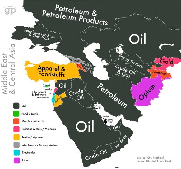 Das Hauptexportgut sagt einiges aus über die wirtschaftliche Leistungsfähigkeit eines Landes. Das macht die von Simran Khosla für die «GlobalPost» erstellte Weltkarte umso interessanter. Der Grafiker hat für jedes Land dasjenige Exportgut aufgelistet, das am meisten Geld einbringt.