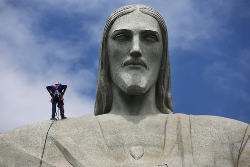 Nein, das ist kein Apple-Angestellter, der da oben auf der Christus-Statue herumturnt