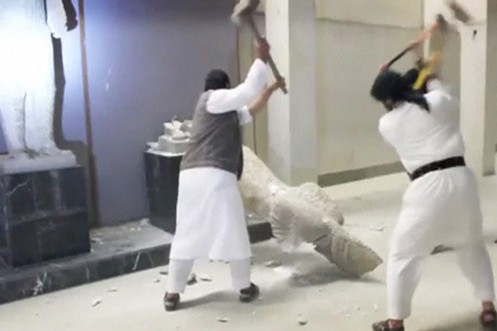 IS zerstört mit Pressluftbohrer und Hämmern 3000 Jahre alte Kulturgüter aus assyrischer Zeit