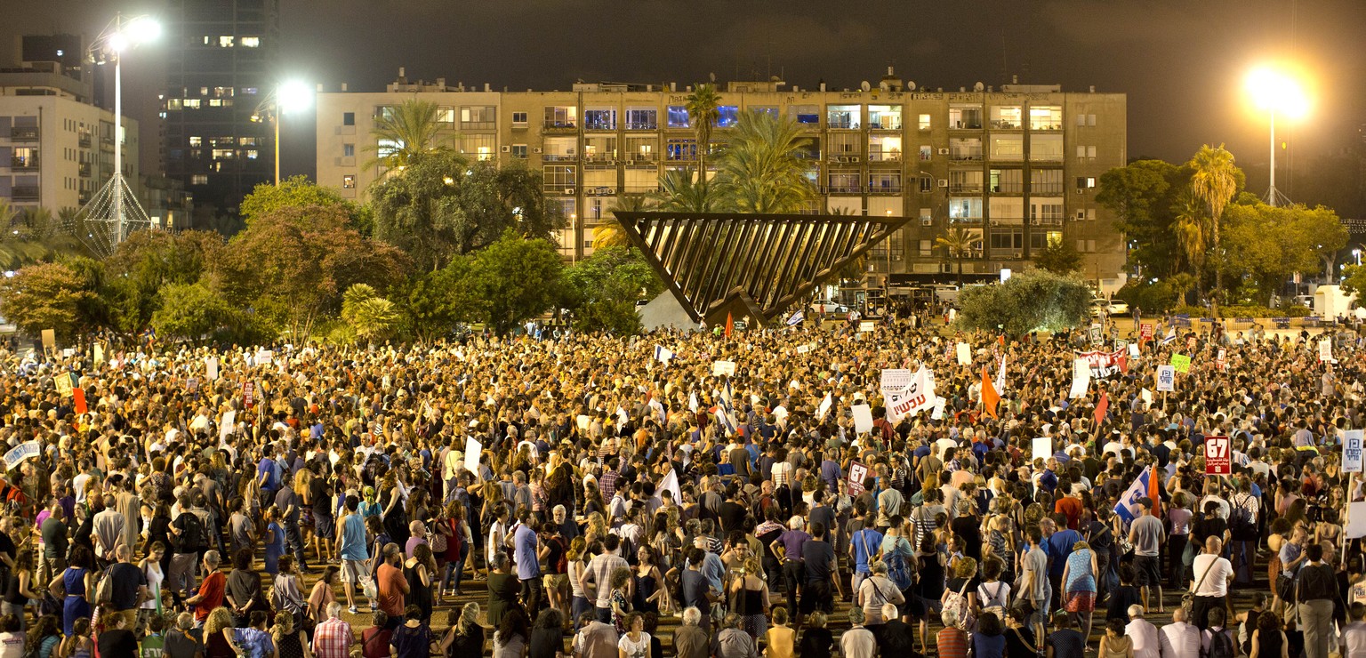 Tausende Israelis demonstrierten am Samstagabend in Tel Aviv für eine Friedensregelung mit den Palästinensern. Israel hatte Anfang Juli als Reaktion auf ständige Raketenangriffe eine Offensive im Gazastreifen gestartet.