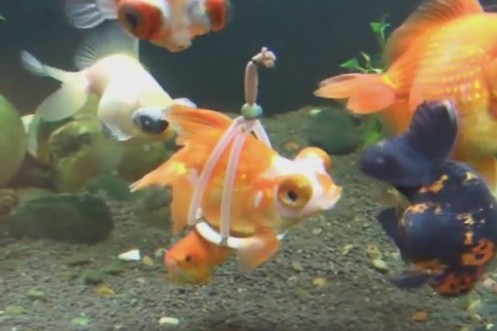 Eine Katze und ein Fisch haben ihr erstes, schlüpfriges Date in einer Badewanne