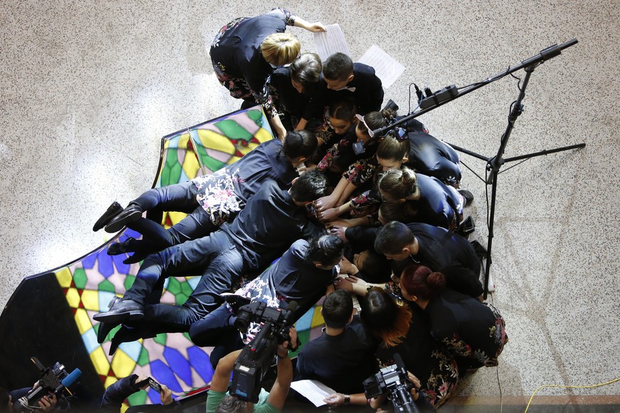 Stehend, sitzend, kniend und liegend haben 18 bosnische Kinder und Jugendliche und zwei Musiklehrer gleichzeitig auf einem Klavier gespielt. Damit wollten sie einen Weltrekord aufstellen.