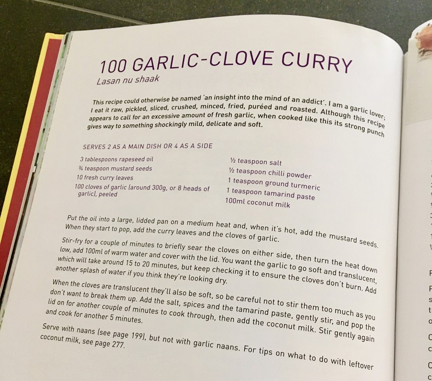 Typisch für Meera Sodha: Einfache Zubereitung und wenige Zutaten. Rapsöl, Curryblätter, Chili- und Kurkuma-Pulver, Senfsamen, Kokosmilch, Tamarindenpaste und – eben – Knoblauch:
