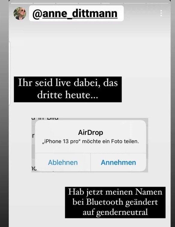 Die Journalistin und Autorin Anne Dittmann ahnte nichts Böses, als sie mit ihren Kindern im Zug in den Urlaub zum Bodensee fuhr. Bis da plötzlich diese Nachricht bei AirDrop aufploppte: «iPhone13 will ein Foto mit dir teilen.»