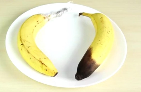 Um die Banane länger haltbar zu machen, brauchst du nur etwas Frischhaltefolie. Trenne die einzelnen Bananen voneinander und pack die Stiele anschliessend in Frischhaltefolie ein.