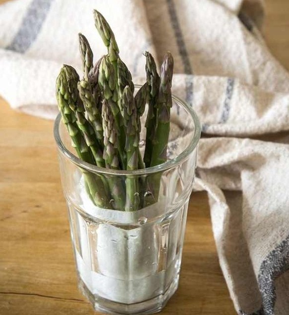 Broccoli und Spargeln hältst du lange frisch, indem du den Stamm in eine Wasserschüssel stellst. Das Gesamtpaket gehört dann in den Kühlschrank. Vergiss nicht, das Wasser täglich zu wechseln.