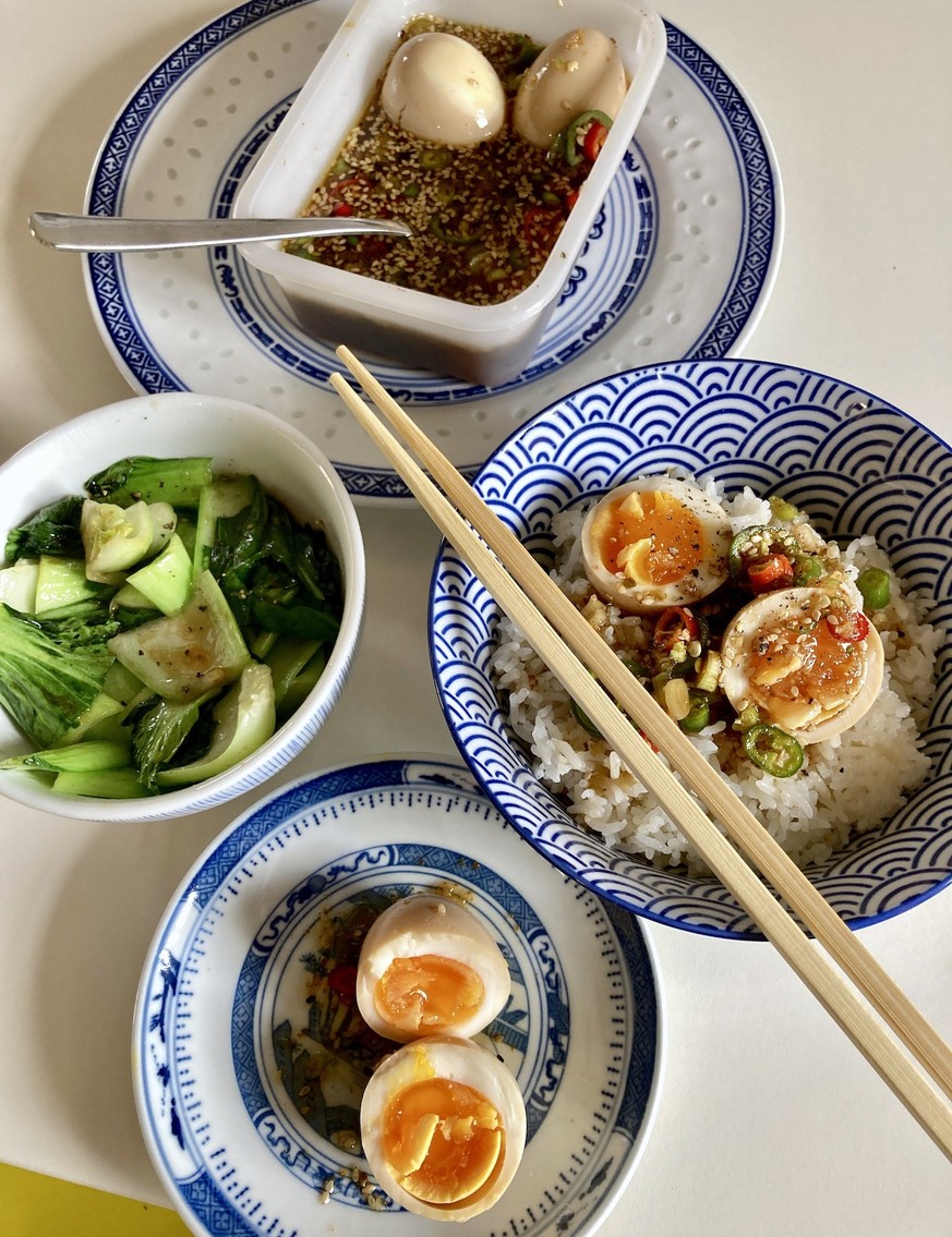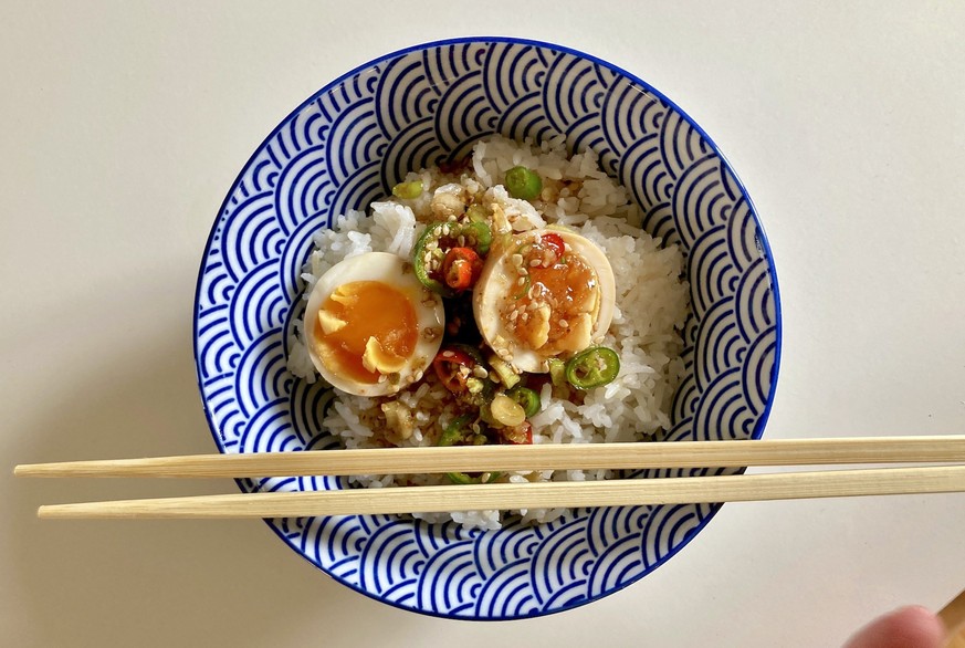 Zum Essen serviert man die Eier auf dämpfendem Jasminreis und träufelt noch etwas von der Marinade darüber.