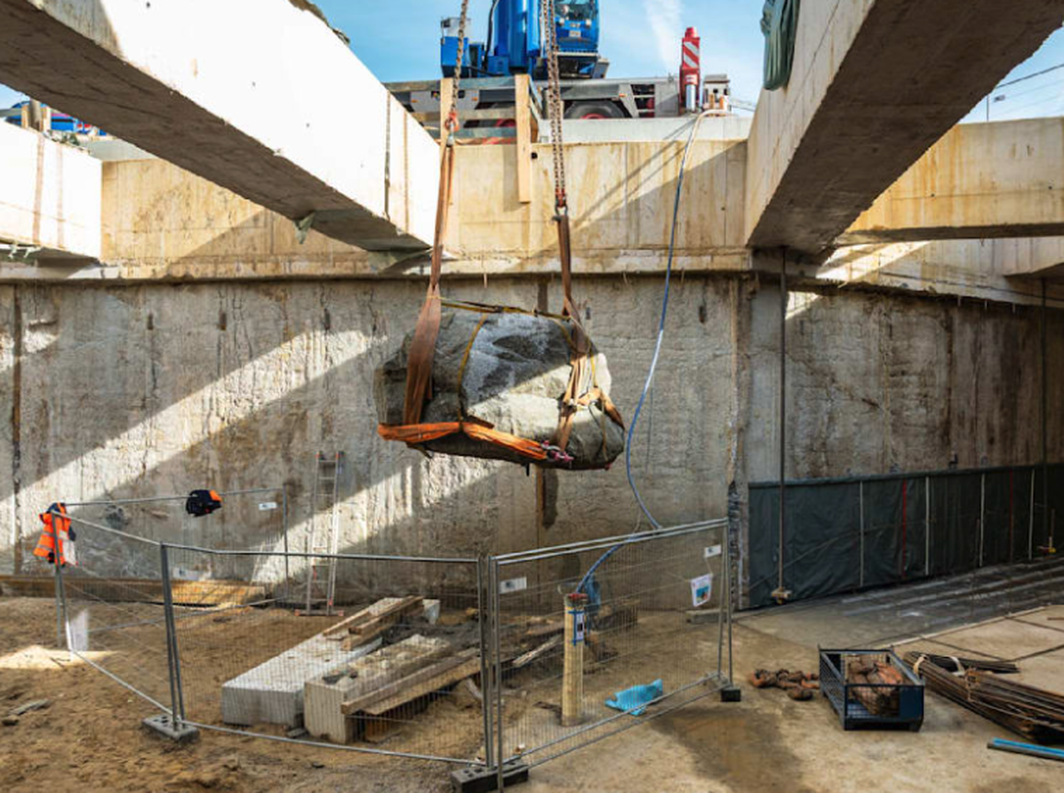 Um den mächtigen Findling zu bergen, liess die Hochbahn einen mobilen Spezialkran aufbauen. Dieser hob den Stein mit einer Hebevorrichtung aus der Grube.