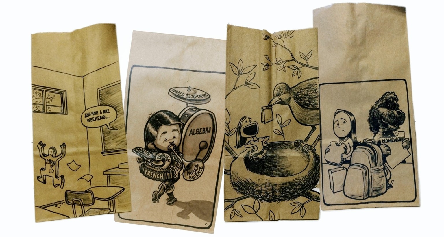Mike, der zu diesem Zeitpunkt gerade aus einer 25-jährigen Karriere als News- und Polit-Karikaturist bei einer Washingtoner Zeitung in den Ruhestand getreten war, kannte den Drill der täglichen Abgabe-Deadline. Und so verwandelte er im Laufe der Jahre mehr als 600 Papiertüten in kleine Kunstwerke, ohne dass er je einen einzigen Schultag verpasste. Meist steckten um die vier Stunden Arbeit in einem seiner Cartoons.