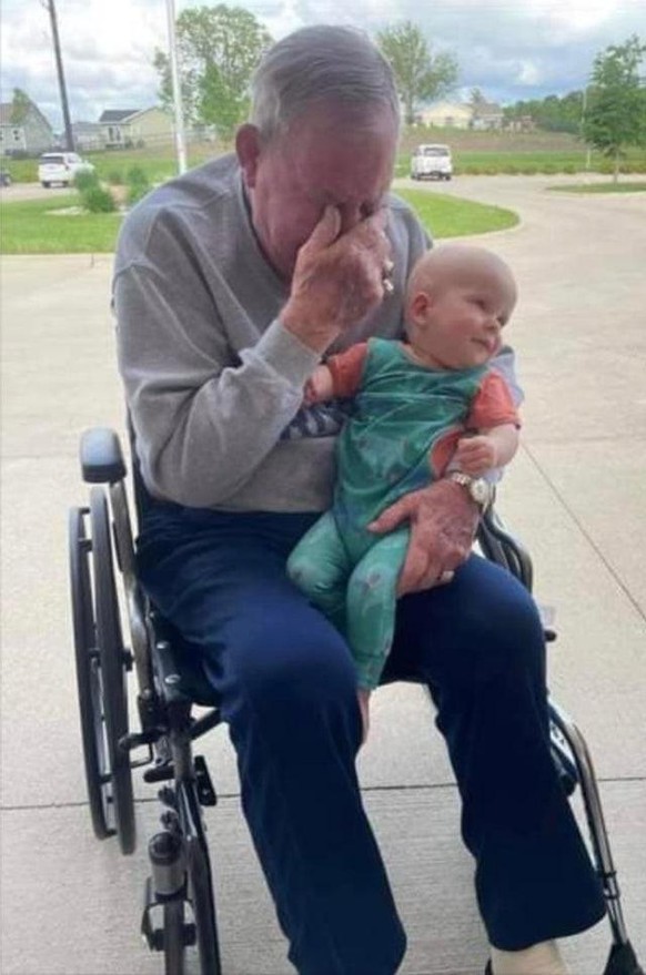 Dieser Grossvater darf seinen Urenkel zum ersten Mal seit dessen Geburt in den Armen halten.