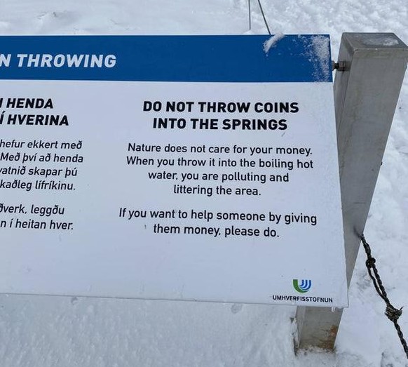 «Bitte keine Münzen in die Quellen werfen. Die Natur interessiert sich nicht für dein Geld. Wenn du es in das kochend heisse Wasser wirfst, verschmutzt du das Gebiet und machst es unbrauchbar. Wenn du jemandem helfen willst, indem du das Geld spendest, dann tu das bitte.»
