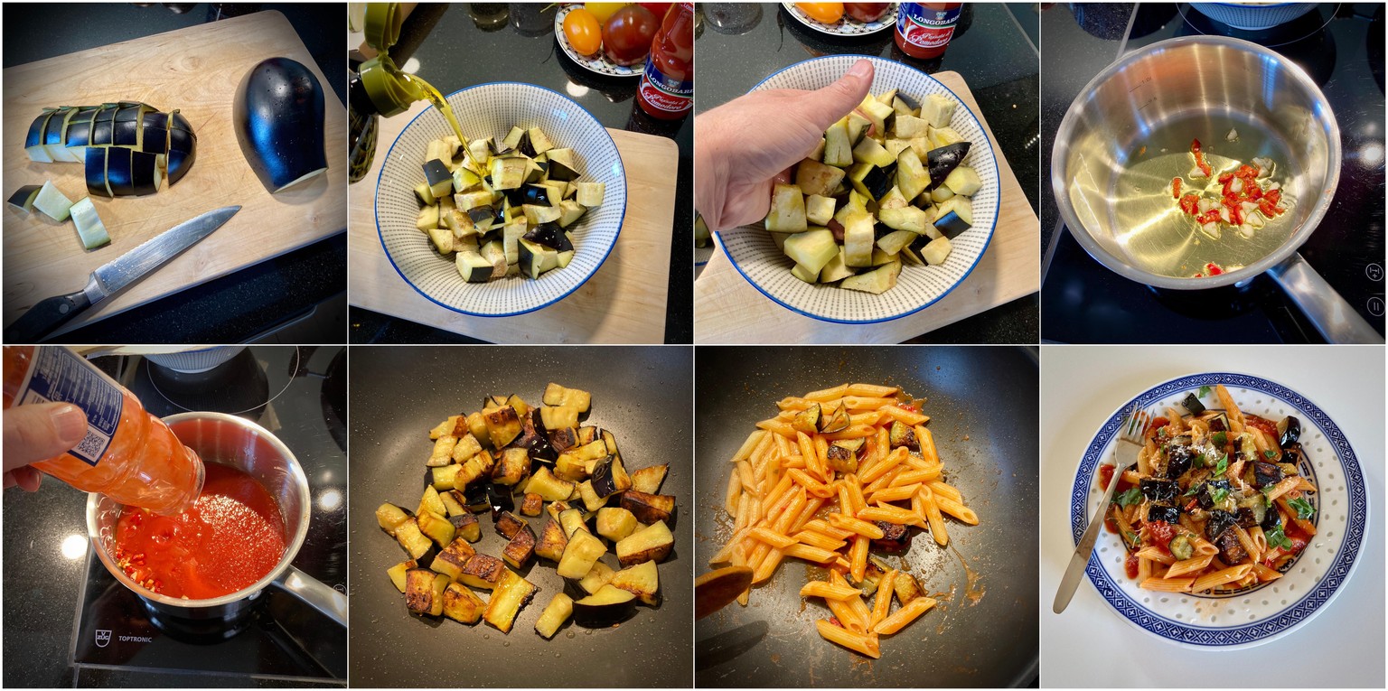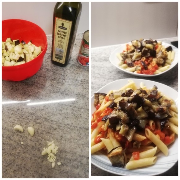 - Ein wenig Tomatensauce unter die abgetropfte Pasta mischen. Die Aubergine beigeben. Etwas Basilikum zerzupfen. Etwas Ricotta drüber reiben. ESSEN.