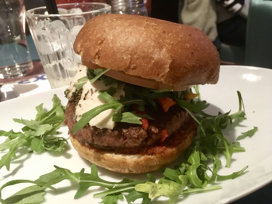 Ortstermin ist einer dieser Zürcher Gourmet-Burger-Läden, von denen es inzwischen diverse gibt (googelt es selbst). Ich bestelle also den Beyond-Burger und zwar mit allem drum und dran: Baumnüsse, ein «veganer Tartare-Frischkäse», rotes Pesto und Rucola. 28 Hämmer kostet der.