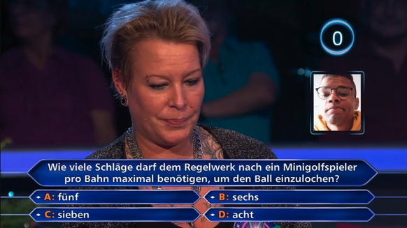 Weil sie die Lösung nicht wusste, rief sie den Telefonjoker. Der kündigte an, schon einmal Minigolf gespielt zu haben, und gab im Anschluss eine Antwort, bei der er sich «zu 70 Prozent» sicher war. Blöd nur, dass die Antwort ziemlich genuschelt daherkam.
