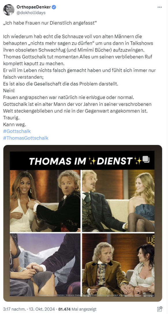 Das größte Opfer der turbowoken Hysteriegesellschaft berufsempörter Dauerankläger ist eindeutig der unbescholtene Thomas Gottschalk. Als hätte er das gerne gemacht! Sein ZDF-Vertrag zwang ihn damals doch, dienstlich ungefragt Frauen überall anzugrabschen!pic.twitter.com/ndz4LQb9XF