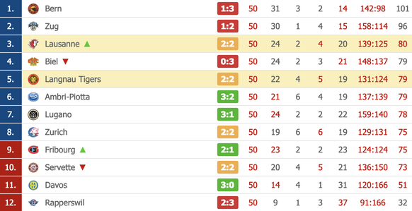 Noch keine einzige Paarung der Playoff-Viertelfinals steht vor der letzten Runde fest. Klar ist neben Berns Platz 1 lediglich, dass der EV Zug die Regular Season auf Rang 2 abschliesst.