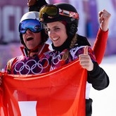 17.02. 2006: Tanja Frieden freut sich schon über den silbernen «Plämpu», als Lindsey Jacobellis ihr Gold schenkt