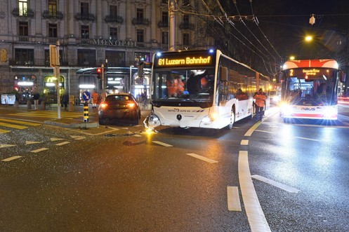 Linienbus fährt beim Bahnhof Luzern in ein Auto