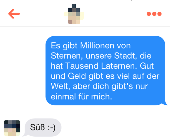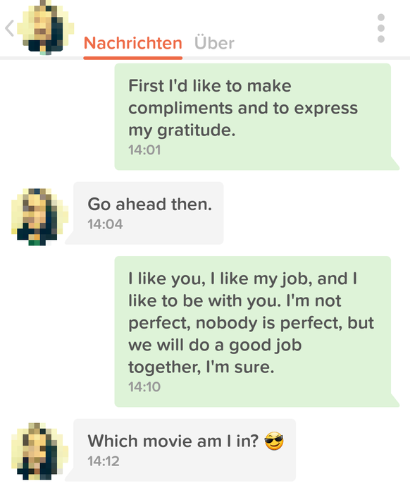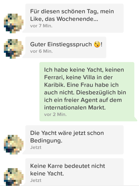 Seither herrscht Funkstille. Teamwork? Gemeinsame Lebensentwürfe? Nicht auf Tinder. Nicht mit dem blatterschen Wortschatz.