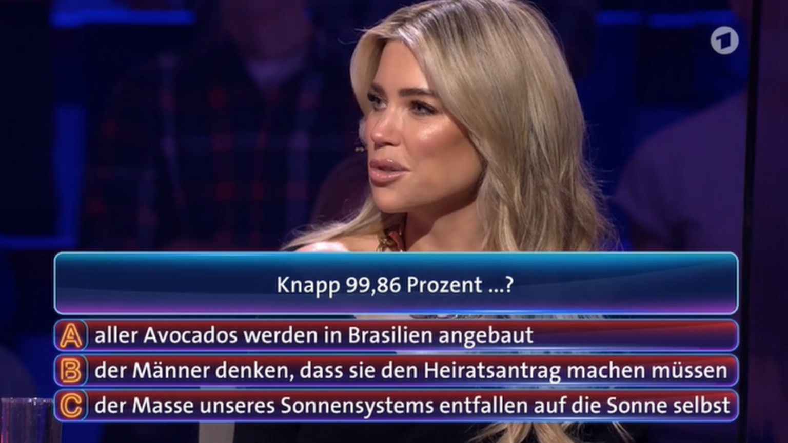 Ganz so glanzvoll wie der Manager schlug sich Lilly Becker als Joker nicht. Sie tippte auf die falsche Antwort, glaubte, dass knapp 99.86 Prozent aller Männer denken, dass sie den Heiratsantrag machen müssen.