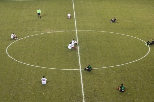 Anpfiff ... und dann sitzen alle ab – Fussballer demonstrieren mit Sitzstreik für Flüchtlinge