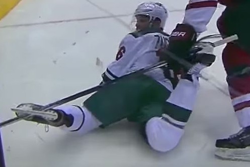 Echt jetzt? Das gibt's doch nicht! Dieser NHL-Spieler kann nicht mehr aufstehen, da sich des Gegners Stock in beiden Schlittschuhen verfangen hat