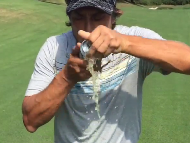 Was macht eigentlich der ehemalige NHL-Star Teemu Selanne? Er ext Dosenbier auf dem Golfplatz ...