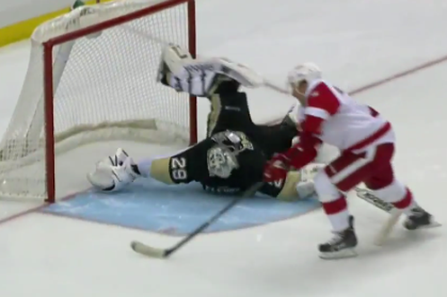 Red-Wings-Stürmer fährt am Tor vorbei, trifft aber trotzdem aus fast unmöglichem Winkel