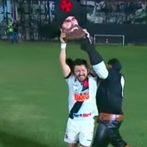 Vasco-Stürmer stülpt sich zum Jubeln den Kopf des Maskottchens über