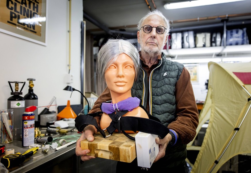 Sterbehilfeaktivist Philip Nitschke präsentiert seine neueste Erfindung: das Suizidhalsband Kairos.Bild: IMAGO / ANP