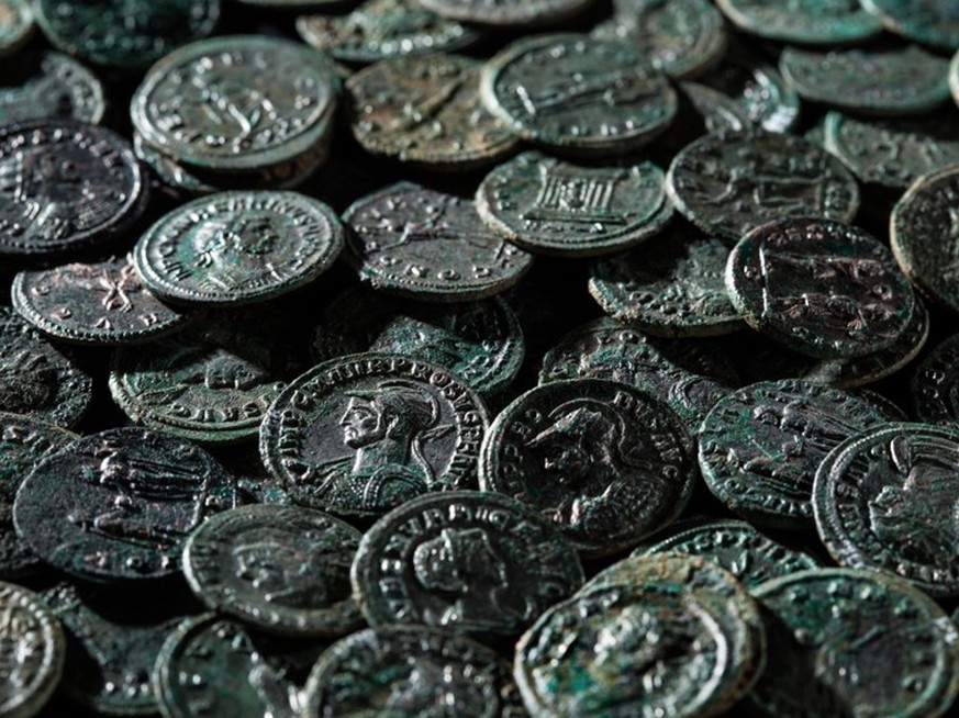 Die Münzen sind sehr gut erhalten und stammen aus der Zeit um 295 nach Christus. Das teilte die Kantonsarchäologie Aargau am Donnerstag mit. Die Fachleute gehen davon aus, dass die Münzen kurz nach der Prägung aus dem Verkehr gezogen und vergraben worden waren.