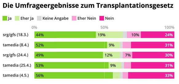 Rund 61 Prozent der Befragten in der jüngsten Tamedia-Umfrage wollen das Transplantationsgesetz annehmen oder eher annehmen. Bei den Anhängerschaften aller Parteien, mit Ausnahme jener der SVP, dominierte die Zustimmung deutlich.