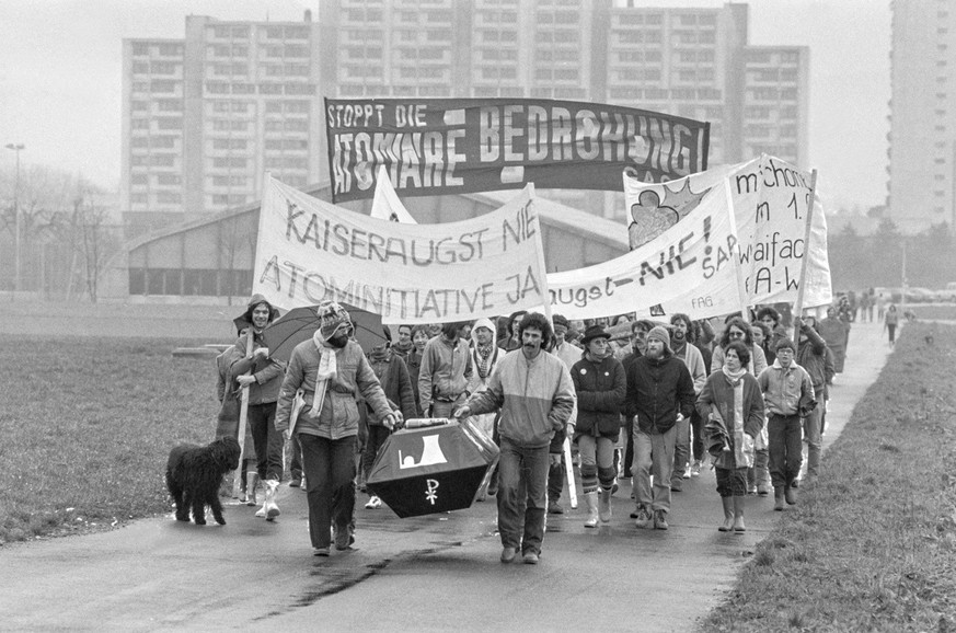 Die Ablehnung der Bevölkerung manifestierte sich in dutzenden Protesten gegen das geplante AKW im aargauischen Kaiseraugst. Diese Proteste dauerten lange an: Bereits 1975 wurde das Baugelände des AKW Kaiseraugst monatelang besetzt, 1988 hatte sich die Lage noch immer nicht beruhigt.