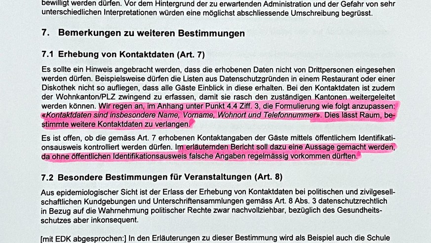 Die Gefahr, dass die Rückverfolgung von infizierten Personen wegen falschen Angaben erschwert werden könnte, war dem Bund und den Kantonen bekannt. Dies zeigt das Dokument, das bei der Anhörung der Kantone für die bundesrätliche Ausrufung der «besonderen Lage» angefertigt wurde. Diese gilt zwar erst seit dem 22. Juni – der «Superspreading»-Event passierte jedoch am Vorabend.