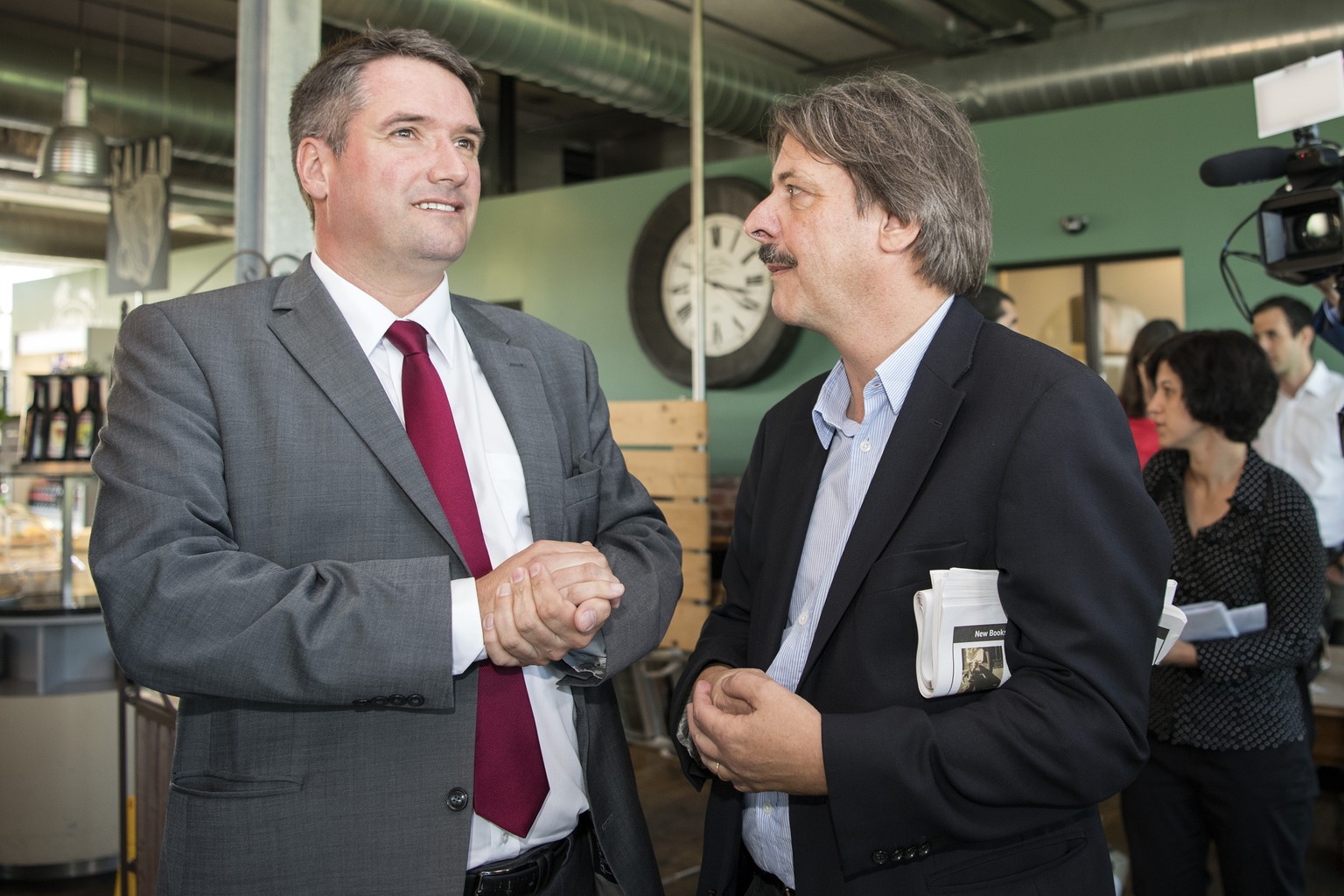 Paul Rechsteiner, Praesident SGB und Staenderat SP-SG, rechts, und Christian Levrat, Parteipraesident und Staenderat SP-FR, sprechen zu den Abstimmungsergebnisse zur Rentenreform, am Sonntag, 24. Sept ...