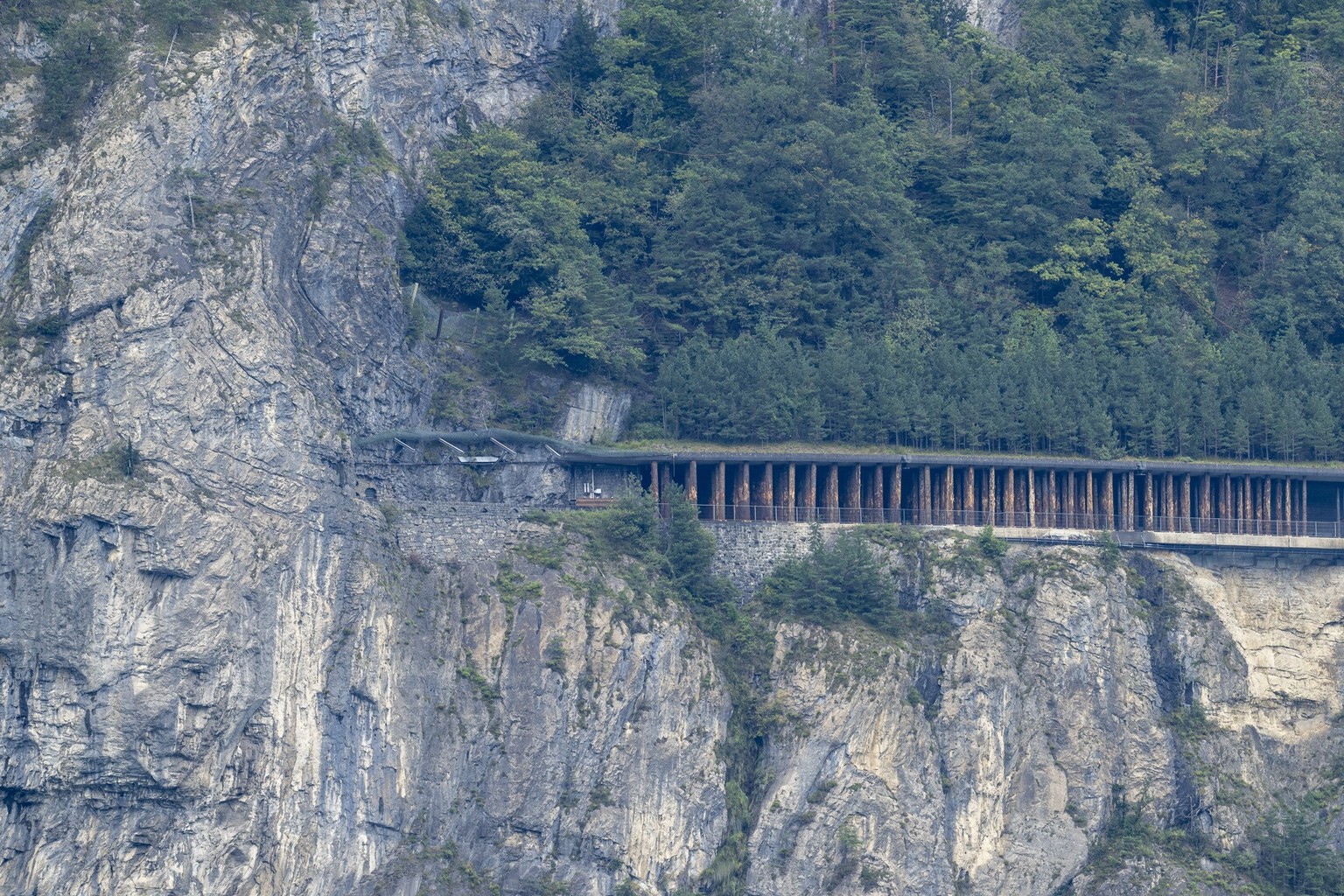 Eine Ansicht auf die Gallerie Axenfluh mit der provisorischen Verstaerkung durch Baumstaemme, anlaesslich einer Medienkonferenz zur Lage der Vorbereitungsarbeiten und Hauptarbeiten vor der Sprengung e ...