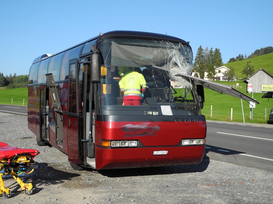 Acht Personen, unter ihnen der 52-jährige Carchauffeur, erlitten leichte Verletzungen. Sie wurden vom Rettungsdienst und von der Rega zur Kontrolle ins Spital gebracht. Der 51-jährige Fahrer des Personenwagens blieb unverletzt. An beiden Autos entstand beträchtlicher Sachschaden. (sda)