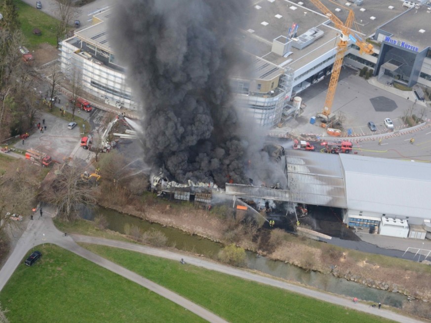 Die ausgerückten Feuerwehren entdeckten den Brandherd in einem Unterstand im Aussenbereich einer Lagerhalle, wo Kunststoffpaletten lagerten. Weil die Halle, in der weitere Kunststoffteile aufbewahrt werden, bereits einsturzgefährdet war, sicherten die Einsatzkräfte vorab die nebenan befindliche Halle mit einem Wasservorhang.