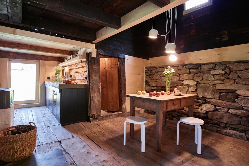 Zwei Personen bietet die Unterkunft Platz. Im oberen Stock – wo früher der Heustock war – befindet sich der grosse Aufenthaltsraum, der auch Küche und Schlafzimmer ist. Unten findest du neben dem Bad und dem Eingangsbereich einen kleinen Abstellraum.